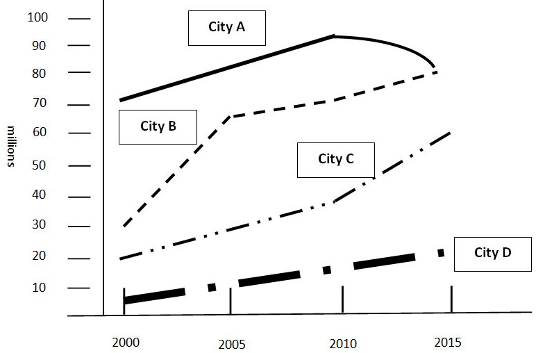 The graph shows the annual number of tourists visiting four cities, namely A, B, C and D respectively from 2000 to 2015.