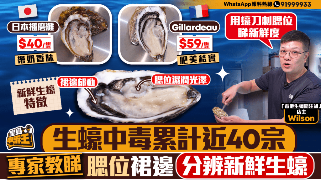 近日生蠔屢爆中毒事件,累計近40宗個案,就連港大醫學院微生物學系講座教授袁國勇都指出冬天進食生蠔有較大風險 。《星島申訴王》就事件訪問市民,有人表示短期內不敢食用,亦有人表示「冇有怕」,更笑言「都唔知食咩出事」。為此,記者找來專家,講解一下最近的生蠔風波,以及教教大家應該如何分辨生蠔好壞,令大家可以安心享用高質生蠔。 分辨靚生蠔靠3招 變壞靠睇腮位加裙邊 在元朗經營生蠔專類店「香港生蠔關注組」的店