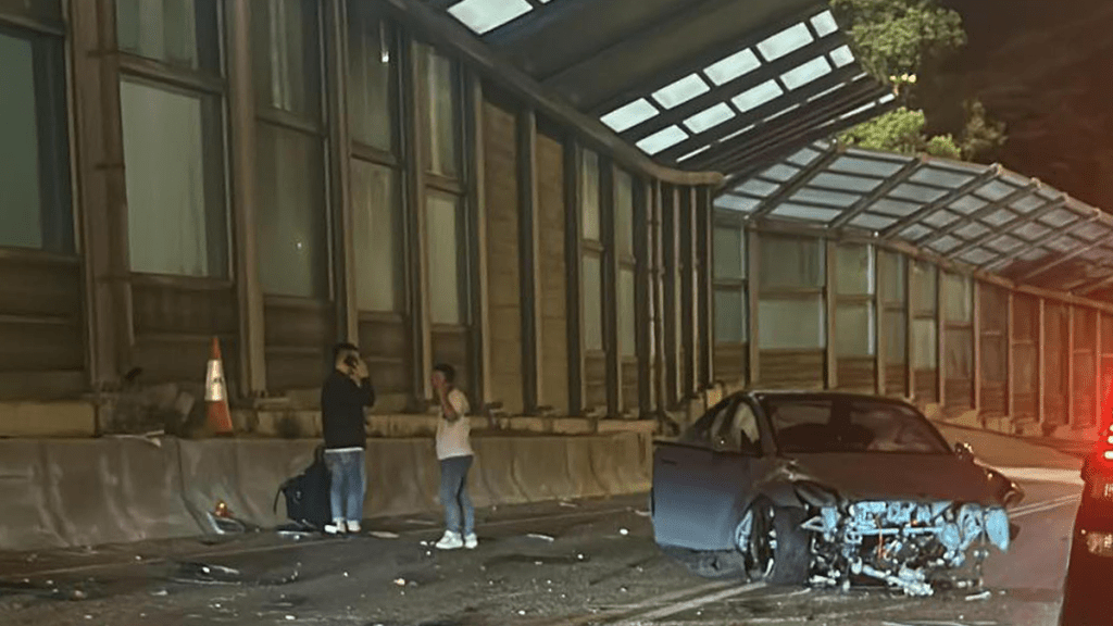 吐露港公路兩車相撞 兩男女不適 私家車嚴重損毀前轆飛脫