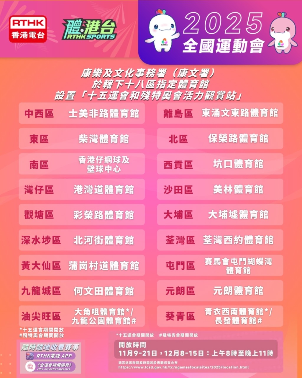 香港此次派出的代表團規模更是創下歷史之最,超過420人的隊伍是香港歷年來參與殘特奧會規模最大、參與項目最多的代表團。隊伍中,既有超過280位懷揣夢想的運動員,也有約140位為賽事保駕護航的隨隊工作人員和醫護人員,他們將共同為香港征戰14個殘運會競賽項目、4 個殘運會大眾項目和7個特奧會項目。回顧歷史,這是香港特區第8次參加殘運會、第6次參加特奧會,而上一屆賽事中,香港特區代表團在殘運會取得10金1銀6銅一共17面獎牌;並在特奧會取得25金9銀8銅共42面獎牌。為讓更多市民感受賽事活力,康文署還在轄下18區指定體育館設置「十五運和殘特奧會活力觀賞站」,讓市民為各選手打氣。