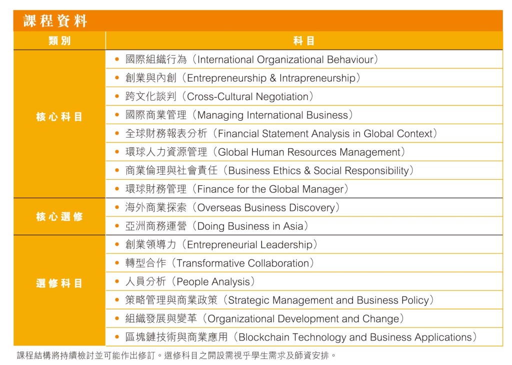 環球企業管理文學碩士(MAGBM)是香港首個同類型專業碩士課程,旨在協助學生掌握跨政治、經濟及文化邊界的獨特技能與洞察力,並能整合全球商業功能,成為勝任跨國企業管理工作的環球專才。課程理論與實踐並重,幫助學生在多元文化環境中管理團隊、應對國際商務挑戰,並建立廣泛的國際事業網絡。為配合大學課程設計要求,課程計劃於來年引入三大新元素:智能(Intelligence)、創新(Innovation)、國際化(Internationalization),以進一步培育未來商業領袖。