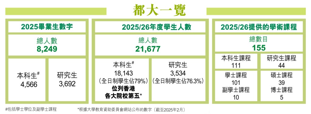 根據國際高等教育機構Quacquarelli Symonds(QS)最新公布的「QS世界大學排名2026」,都大首次獲納入排名,名列第781至790位,成為本港首間上榜的自資大學及應科大,印證大學在學術聲譽、研究影響力及畢業生就業能力等方面獲國際認可。