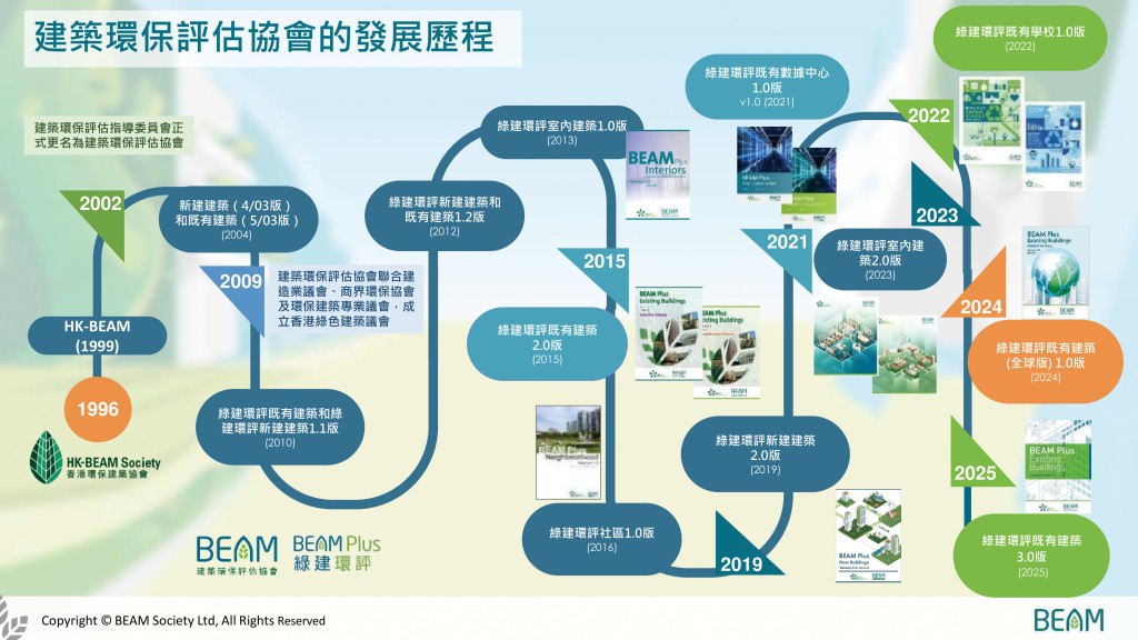 「直到2008年,由特區政府牽頭業界籌組綠建環評機構;翌年協會聯同建造業議會、商界環保協會及環保建築專業議會共同成立香港綠色建築議會。2010 年,『建築環保評估協會有限公司』正式成立,標誌着協會邁向制度化與專業化的重要里程碑。其後於2016年成為公共機構。30年來,協會始終努力不懈為業界釐定全面中立的評估方法,為建築物的整體質素作出專業評級。」