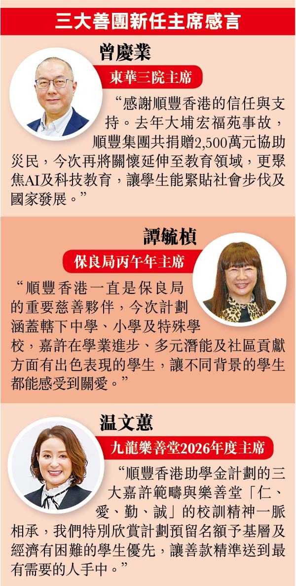 順豐香港不僅重視捐贈,更着重承諾的兌現。去年大埔宏福苑事故發生後,順豐集團第一時間啟動緊急機制,並在一星期內迅速與東華三院落實2,500萬元*的捐款安排,善款隨即按承諾方向,經由東華三院的嚴謹機制發放,體現順豐對每一個承諾的負責態度,以實際行動履行企業責任。是次合作的東華三院、保良局及九龍樂善堂,均為香港主要慈善團體,擁有嚴謹的善款管理及監控機制,確保每筆資源精準送到最有需要的學生手中。助學金計劃將由三大善團根據轄下學校學生的實際需要推薦人選,經過評審程序後發放,確保善款用得其所、有責任、可追溯。