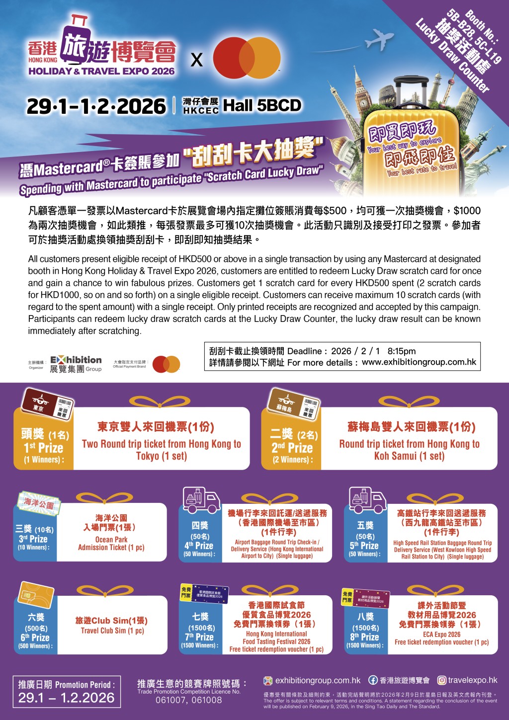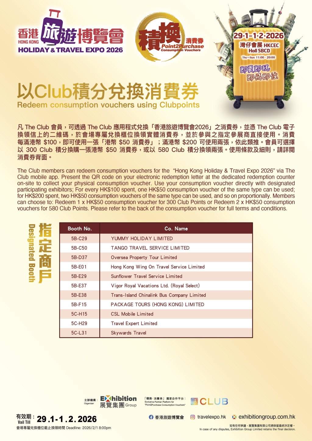 而上屆展覽集團夥拍香港電訊旗下會員獎賞平台The Club推出的「積換‧消費券計劃」大受歡迎,亦將於「香港旅遊博覽會2026」再度回歸。The Club會員可透過The Club應用程式,以300 Club積分換購單張「香港旅遊博覽會2026」$50消費券,或以580 Club積分換領兩張消費券。憑電子換領信上之二維碼,可於會場專屬攤位換領實體消費券,於指定參展攤位直接抵扣消費。