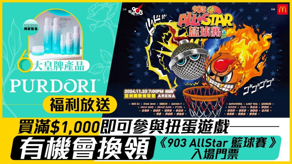 PURDORI福利放送 買滿$1,000即可參與扭蛋遊戲 有機會換領《903 AllStar 籃球賽》入場門票