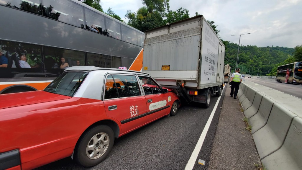 事發在早上7時許,一輛重型貨車沿城門隧道公路往沙田方向行駛,駛至近美松苑附近時,與一輛中型貨車、一輛輕型貨車、一輛小巴及一輛的士發生碰撞,小巴司機一度被困,由消防救出。傷者包括2男5女,全部清醒送院治理。