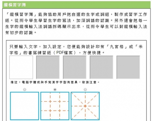 由教大研發的網站「縱橫習字簿」(按此),介面清晰、簡單易用,用家只要在五個方格中輸入文字,然後再選擇字型大小、顯示行數及輔助綫,就可製成習字工作紙,特別的是它還可自製成「九宮格」或「米字格」工作紙,前者可訓練孩子寫字時的字體大小、筆劃的一致性,後者則可練習寫字時的結構重心。