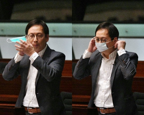 可以見到柯創盛質詢口罩問題時,即場拿出一個綠色外科口罩,不假思索就套上面,但就將綠色面向住自己,白色一層反在外面,更似乎未有將口罩好好拉直攤平。