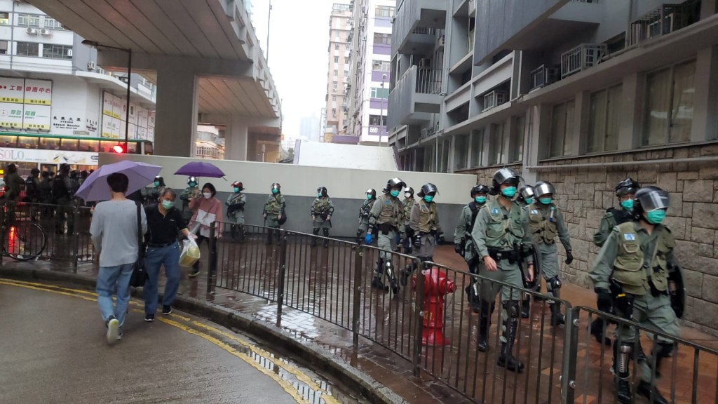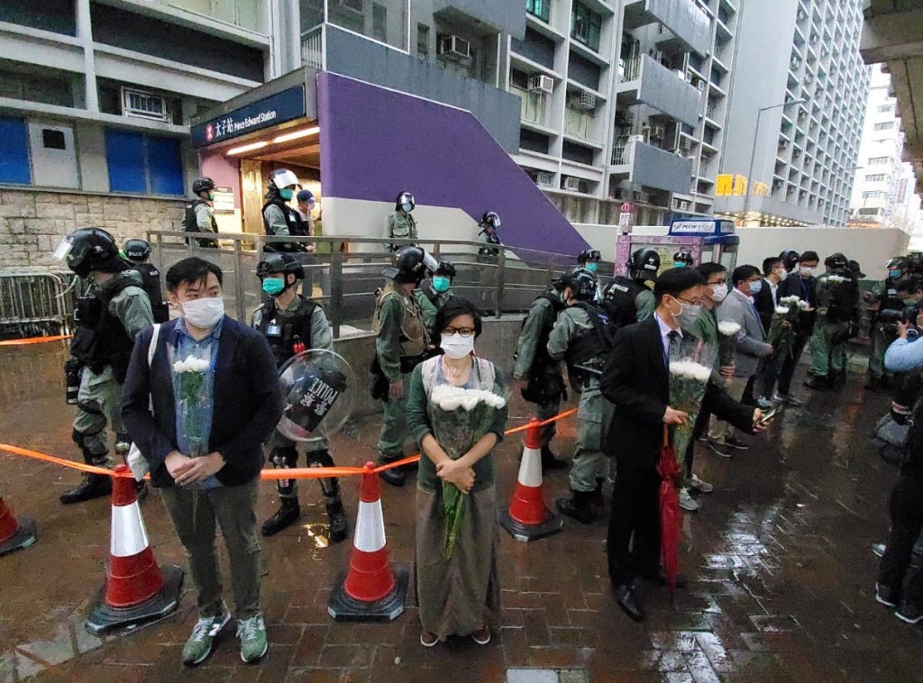 晚上6時許,港鐵太子站外B1出口位置已拉起封鎖線,6名市民則手持鮮花,站在封鎖線外。一批防暴警察則在場駐守,並在現場呼籲在場的市民離開。另外,在彌敦道,亦有警車停泊在場。附近商戶提早關閉。