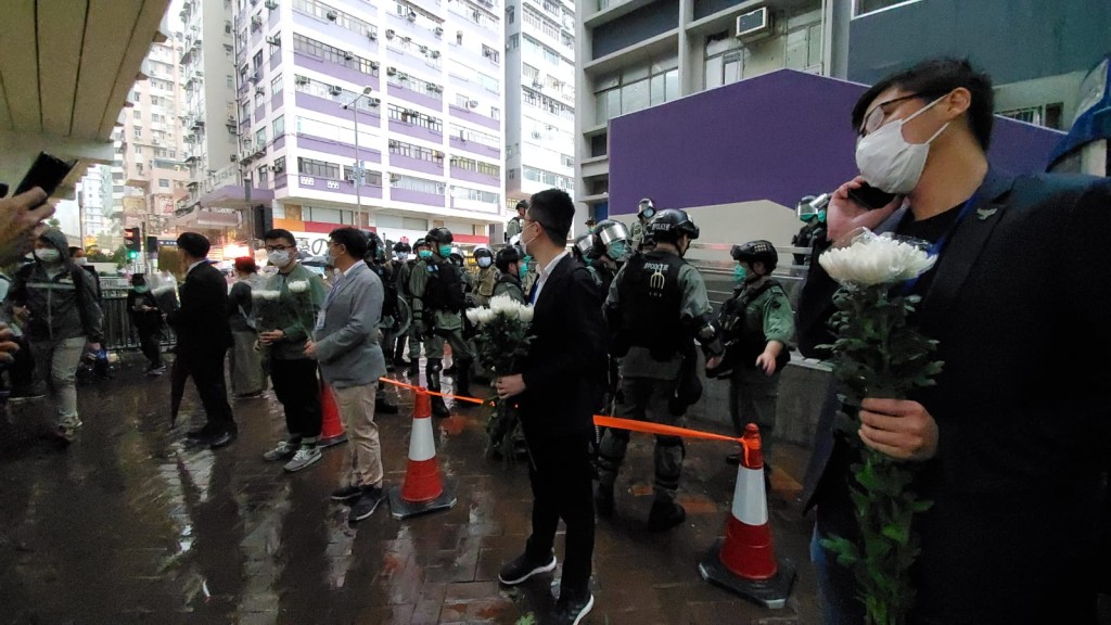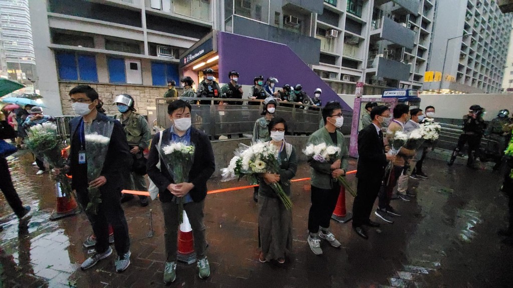 晚上近7時,由於出口外被拉起封鎖線,有油尖旺區議員在場放置紙箱讓市民放下鮮花。其後,陸續有人到場擺放鮮花,並有人在場高叫口號抗議,防暴警則到場增援。其後,警方在太子道及砵蘭街交界舉起藍旗,警告在場人士離開,否則會以武力驅散。另外,有警員持長槍戒備,又在場驅散聚集者。警員又在砵蘭街一帶截停多人。