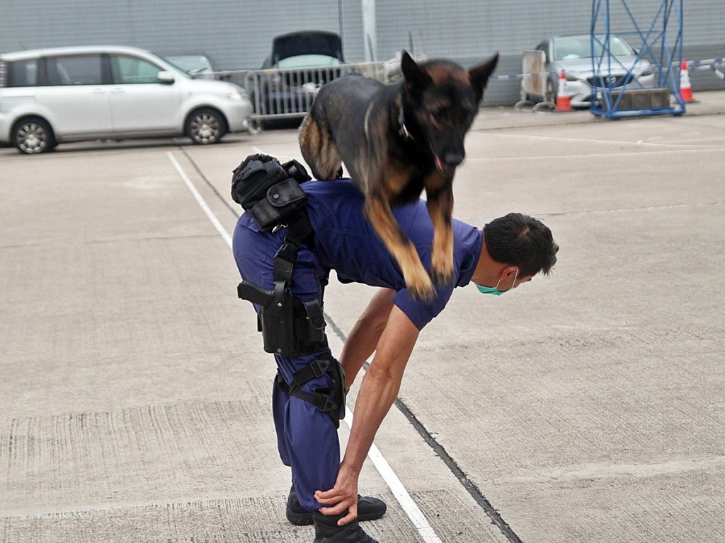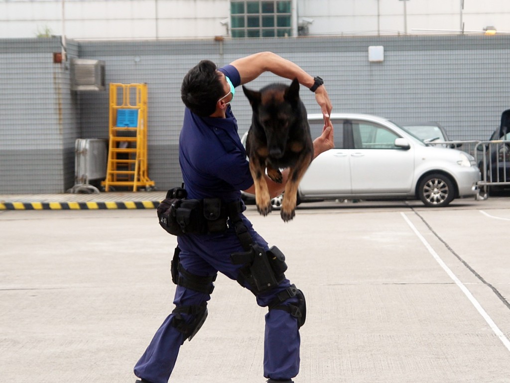 機場特警組現時共有3頭警犬,其中一頭由狼狗及瑪蓮萊犬混種而成的警犬,在領犬員牽引下亮相,並示範兩套高難度動作,領犬員首先以雙手擺出圓圈手勢,警犬隨即在不遠處位置開始跑動,然後一躍而上穿過圓圈,隨後男警彎腰充當「人肉欄杆」,警犬亦輕易跳躍跨欄,絕對「有姿勢、有實際」。