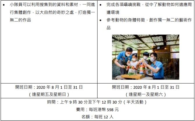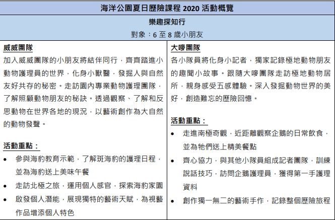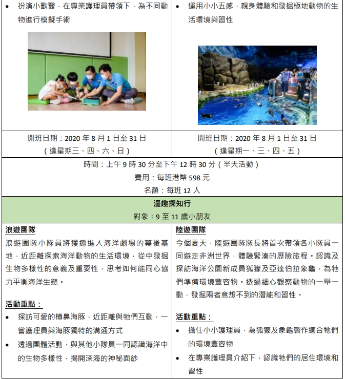 課程活動包括為海洋公園的最新動物大使狐獴家族和亞達伯拉象龜準備環境豐容物、親身餵飼企鵝、探訪極地動物,以及參與海豹教育。公園已全面加強衛生防疫措施,包括為小朋友量度體溫和在活動開始前消毒雙手,所有參加者需全程佩戴囗罩,每班人數亦減半至最多12人一班。課程將於7月14日下午4時起於海洋公園官方網站接受公眾報名,網上報名可享95折優惠,而智紛全年入場證會員更可享85折優惠。