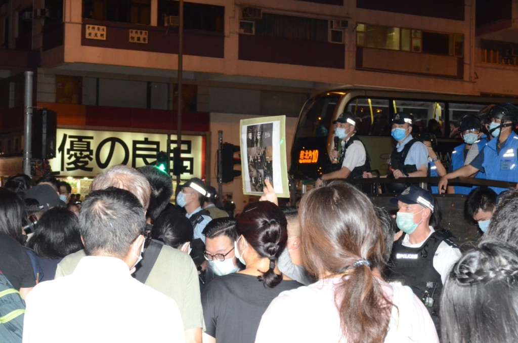 晚上7時,防暴警察在太子道西一家銀行外,要求帶走一名拒絕離開的女子,現場人群不滿叫囂,與警員發生推撞。警員警告人群違反限聚令。警方太子道西展示藍旗警告非法集結人群立即散去。
