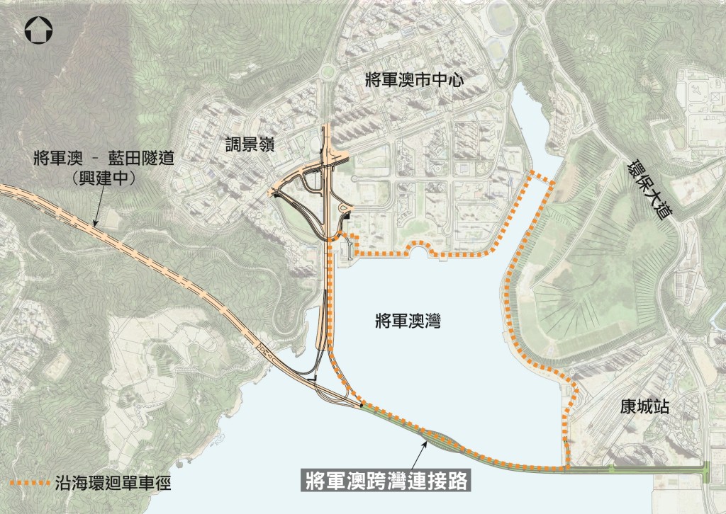 新路亦將直通調景嶺和將軍澳市中心,未來可分流環保大道及將軍澳市中心附近道路的車輛,將軍澳跨灣連接路計畫於2022年竣工。