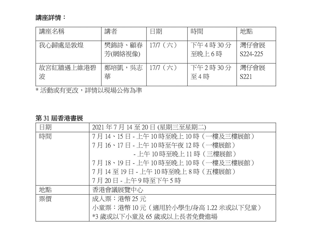 今年書展將會邀請到顧春芳連同樊錦詩,以《我心歸處是敦煌》爲題,在線上分享樊錦詩在敦煌的心路歷程。而鄭培凱也會和吳志華出席《故宮紅牆遇上維港碧波》講座,講解香港故宮文化博物館如何成爲一個中國文化藝術的堡壘。有興趣的觀眾可前往香港書展網站了解更多講座最新資訊或預留座位。