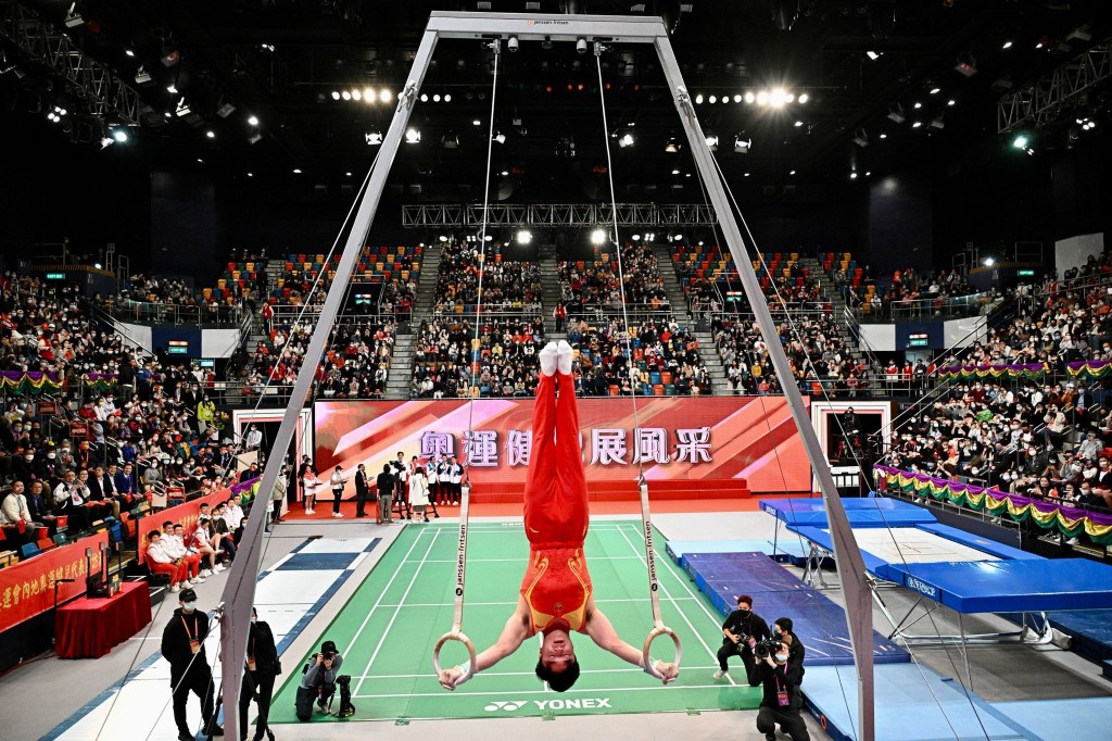 國家隊健兒展開第2天訪港行程,部分團員今早在伊館參加「羽毛球、劍擊、體操及乒乓球運動示範」。表演開始前,場內先舉行升國旗奏國歌儀式,全體人員肅立。表演由體操隊打頭炮,東奧競技體操男子吊環金牌得主劉洋率先示範,上演精湛的高難度動作。