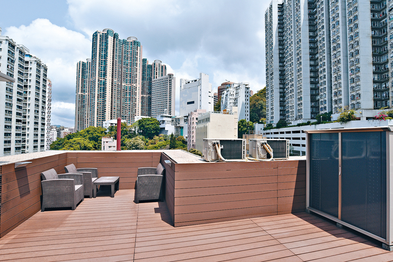 馬上帶各位參觀文豪花園頂層連天台特色戶,實用面積685方呎,3房1套設計。單位屬罕有相連戶,甫入屋內,敞亮四正的客廳,多用上木系家具布置,沙發貼牆而放,活動空間充裕,不同深淺度的啡色配襯得宜,旁邊兩扇窗戶亦為一室補足光 。客廳一隅是旋轉樓梯,連接客廳及天台,住客可在私人天台享有更廣闊的戶外空間,已鋪有戶外木板,住客可在此望到附近市景,更可遠眺少量海景。