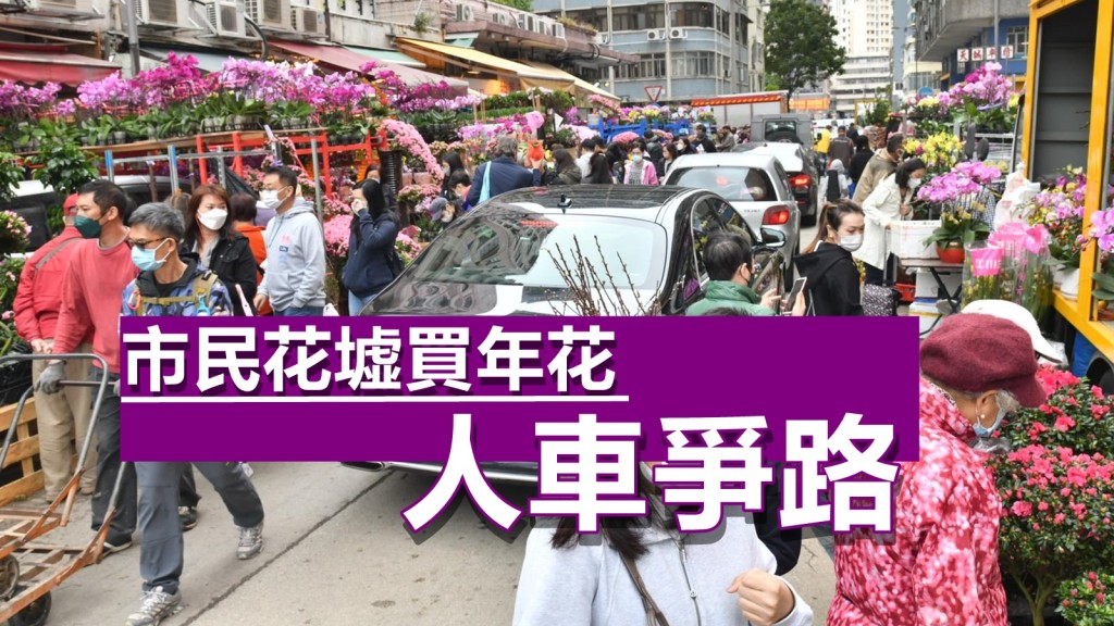 今年的農曆年宵市場已因為香港疫情大爆發而取消,年近歲晚,有心急買年花的市民,毋懼疫情在社區擴散,冒著微雨,趁今日周末到旺角花墟選購心頭好,令路窄的花墟出現人車爭路情況。