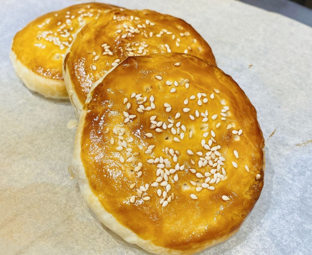 7.將麵糰放上烤盤,餅面掃上一層蛋漿,待乾後再掃一層蛋漿;用叉在餅面打氣孔,然後撒下白芝麻。放入預熱至攝氏220度焗爐烘焙15分鐘,直至表面金黃色。