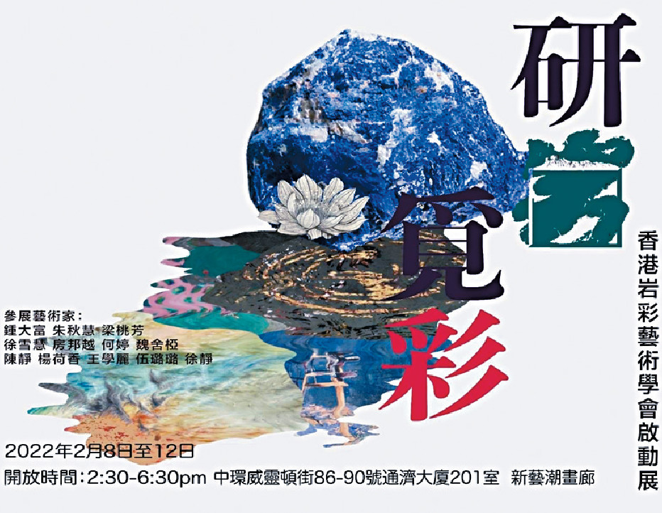 去年剛成立的「香港岩彩藝術學會」舉辦起動展覽《研岩覓彩》,展示十二位香港及內地藝術家逾二十幅岩彩作品,包括會長鍾大富、副會長朱秀慧,以及其他藝術家包括王學麗、伍璐璐、何婷、房邦越等等。作品包括風景、人物、植物等,展現岩彩藝術美態。