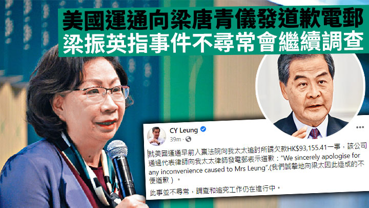 前特首梁振英妻子梁唐青儀疑因未找卡數,早前遭信用卡公司美國運通入禀區域法院,追討約9.3萬港元本金及欠款利息。梁唐青儀其後向傳媒指已清還所有款項,不知對方為何會入稟,會再作了解。至今日,梁振英在其社交平台表示,已接獲美國運通代表律師的道歉電郵,又引述電郵指「We sincerely apologise for any inconvenience caused to Mrs Leung.(我們誠摰地向梁太因此造成的不便道歉)。」