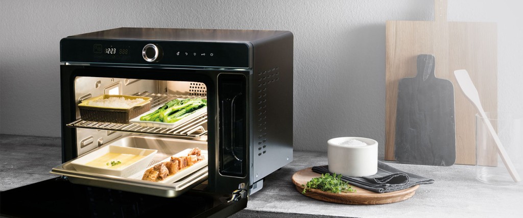 如煮食是以實際為主,Sharp這款蒸焗爐最簡單直接,集焗爐、蒸氣及微波爐於一身,只需按鍵即可轉換三種模式,一百至九百瓦輸出,具備蒸煮功能,亦可調校至六十一分鐘以上。機身的深度只有三十九厘米,一般四五百呎單位的廚房已可容納得到。機身小小而內籠實用,可放入直徑廿八厘米的燉盅。