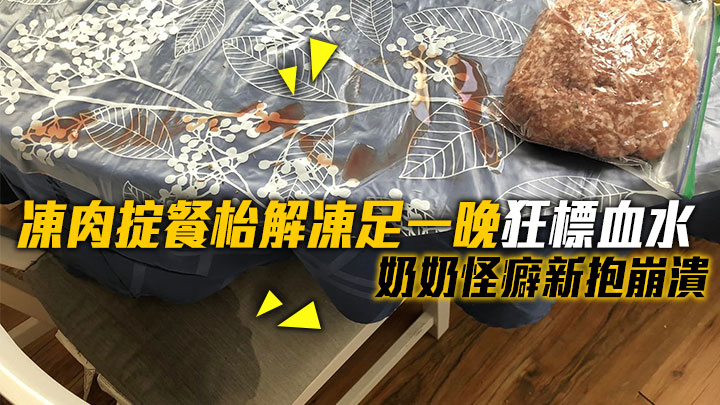 有女網民日前在fb「同住奶奶好惡頂自由討論區」內發文,指奶奶解凍肉的方法竟是將肉放在餐枱上,「乜搵隻碟裝住袋肉嚟解凍真係咁難㗎咩?睇嚟袋肉放响室溫已經好耐」。根據她上載的相片所見,該包放在保鮮袋內的免治豬肉僅放在餐枱上,沒有用器皿裝好,其中大灘血水沿着餐枱流到到餐椅,椅墊更幾乎濕透。