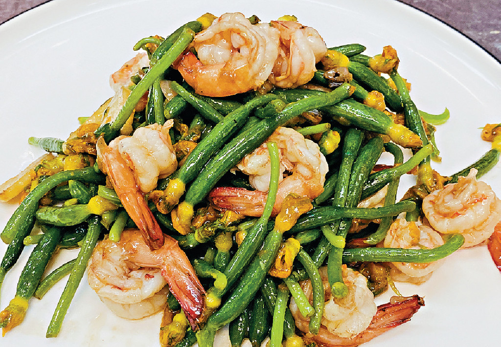 聽到廚藝師傅李文基說要炒一道青瓜炒鳳尾蝦,心中不禁納悶,怎麼菜式如此普通!這是小時候媽媽常做的家常菜,青瓜切片炒赤米蝦。赤米雖甜,但頭殼內總有沙,蝦殼又偏硬,所以吃剝了殼的蝦仁特別暢快,而且對小孩子來說,除了西瓜,對冬瓜、青瓜、苦瓜、白瓜、節瓜、佛手瓜等往往沒多大興趣,這道菜的青瓜只會應酬式地吃幾片,鮮甜赤米才是主角,有時媽媽會改用韭菜花炒蝦仁。