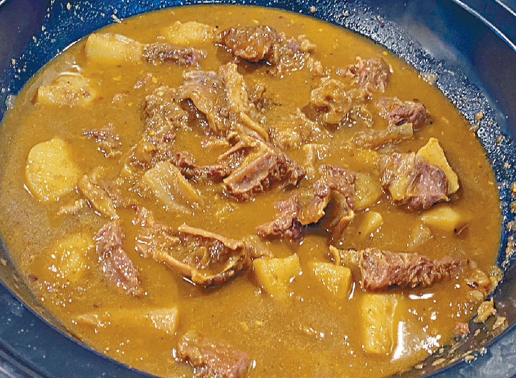 趙公子這鍋咖喱炆坑腩(見圖),是印度風味,以二十六種原材料和香料熬成,令人吃不停口,老實不客氣,把剩餘幾件牛腩和咖喱汁一滴不留打包帶走。問有甚麼秘方和各種材料的份量,他二話不說慷慨傳來。大膽將之公開,成份:洋蔥、大蒜、紅蔥頭、香菜、芹菜、蘋果、香蕉、薑、陳皮、紅辣椒、茄子、鹹柑桔、大蔥;香料:黃薑粉、南薑粉、雞粉、咖喱粉、小茴香、Dawson咖喱醬、番茄醬、檸檬草、草果、白豆蔻、桂皮、大茴香、月桂葉、甘草、丁香、忌廉、椰奶。