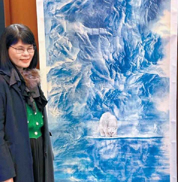 以湛藍水墨噴染技法,李志敏在藍與留白之間,塑造冰川山嶺,空茫四野中,一頭北極熊獨自在冰岸邊沿低頭,似在舔雪解渴,也像在伺機撲海捕魚,環境險峻,牠努力求存,生命的意志力,躍然宣紙之上,本已令人感動,誰知掃了QR Code ,再透過手機照這一幅名為《冰川的引力》的新派水墨畫,小屏幕上的畫面飄下皚皚白雪花,場面淒美,李志敏以畫喻環保之心,更具撼動力了。