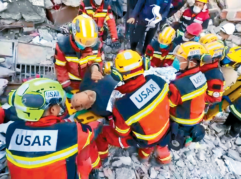 特區救援隊59名成員在土耳其地震災場搜索約40座建築物,面積達2.8萬平方米,救出4名生還者。消防處署理消防隊目梁志宏救出首名生還者,他憶述當時在瓦礫下約六米發現生命跡象,但洞口細,團隊開闢一條通道進入,他沿着狹窄得不能轉身的通道,跨過重重鋼筋石屎,找到一名生還者,對方當時氣息微弱,即使未被重物壓著,但傷勢不明,梁先撤回,再由救護員接力入內,確認生還者沒受重傷,將其移離救出地面。梁形容,見到生還者當刻,「開心同興奮」,「隨即諗點樣可以將佢盡快移到安全嘅地方」。