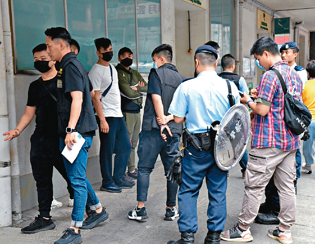 警方昨午接報有大批可疑人士自早上起,於九龍城龍崗道1家麻將館外聚集,派出10多輛警車、多名持防暴盾警員及反黑組探員往現場,帶走10多名男子涉嫌非法集結(圖)。據悉涉案者有黑幫背景。