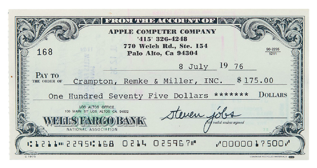 這張面額175美元的支票保存完整,上方標明日期為1976年7月8日,是蘋果公司成立的年份,支票上使用了蘋果公司原始名稱「Apple Computer Company」,地址也是蘋果的第一個官方地址,即是喬布斯在自家車庫建立蘋果時用於回信、郵件投遞的地址。
