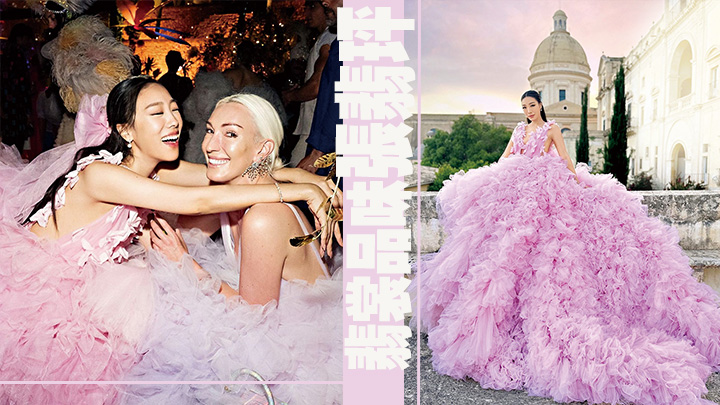 由於婚宴派對分兩天舉行,Feiping精心挑選了兩套不同風格的禮服,「第一晚派對在Villa Elena,一間歷史悠久的巴洛克式別墅舉行,所以我選了Pamella Roland設計的禮服和Judith Leiber的水晶晚宴包,禮服上有很多精緻的珠飾和羽毛襯托別墅的氣派。第二晚的主題則是超越想像的幻境,所有賓客都發揮了自己的創意,穿着非常華麗特別的服飾。我自己一直都很喜歡大型的紗裙,所以這次穿了倫敦設計師Millia的作品,全身夢幻的粉紅,在古堡前打卡,猶如置身夢幻的童話世界。」