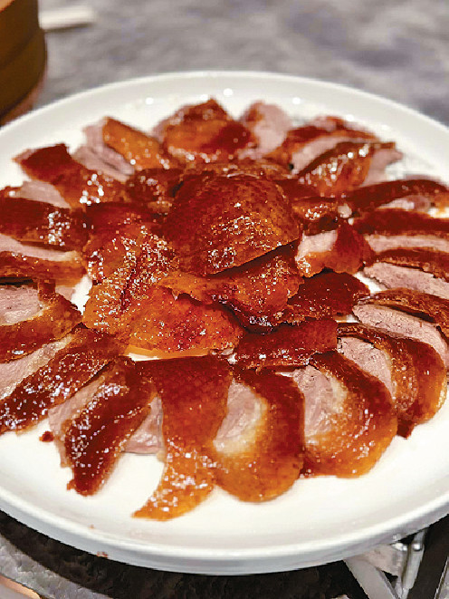 「宮爆大明蝦」是北京樓的「名物」,每次來必點,採用大蝦蘸粉漿炸到酥脆,入口又嘗到彈牙的蝦肉,配微酸不太甜的醬汁,人人愛吃。喝過滋補有益的「桃膠海皇豆腐羹」,主角「烤北京填鴨」出場,脹卜卜,紅光油亮,賣相討人歡喜,由侍應堂前切薄片,識食的朋友下筷對準鴨胸部位不帶肉的兩三件皮,夾起如薄身的威化餅,他說入口鬆化,脂香高逸;另一朋友就挑連皮鴨腿肉,形容肥瘦適中,肉嫩汁多,伴以海鮮醬、青瓜、京蔥及麼麼皮同吃,鴨味濃郁,享受無以尚之。