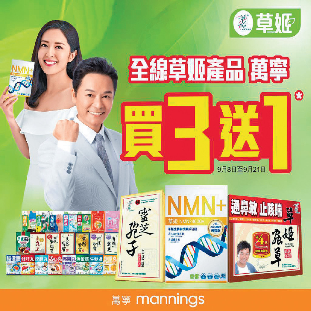 無論係調理病弱體質或日常保健,由NMN24000+、靈芝孢子、蟲草CS4、活心丸到亮目丸,草姬總會有一款產品幫到你。依家仲推出咗激抵優惠,由9月8日到9月21日,喺萬寧買草姬全線產品款款買3送1(以價錢最低一件計算),大家可以自由配搭。