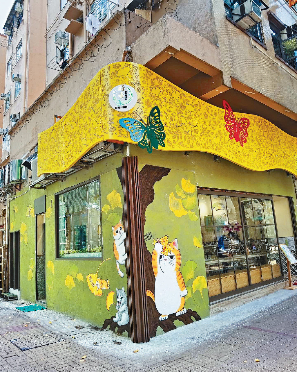 呢度地方細細,整體感覺清新自然,外牆充滿郊野嘅元素,加上「總是餓」同「暴吃不肥」嘅可愛貓咪,吸引好多人嚟打卡。而室內裝潢雅潔舒服,牆上嘅大蝴蝶浮雕代表蛻變,仲有一棵鋁質銀杏樹O添!店員同Cally講銀杏代表長壽,希望大家食素可以健康又長壽。