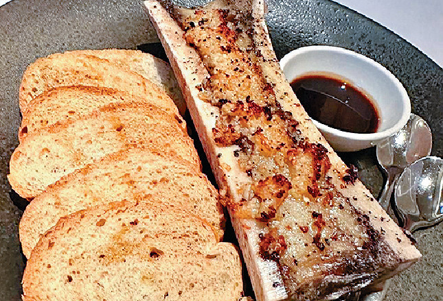 牛骨髓長約6吋,伴6件脆麵包片,燒至中央脂肪亮麗,恰到好處,以小匙舀,如啫喱狀,放在脆包片上蘸點黑醋,減除油膩,入口甘香,豐潤的滋味,是與好友共晉晚餐的幸福感,乾杯。