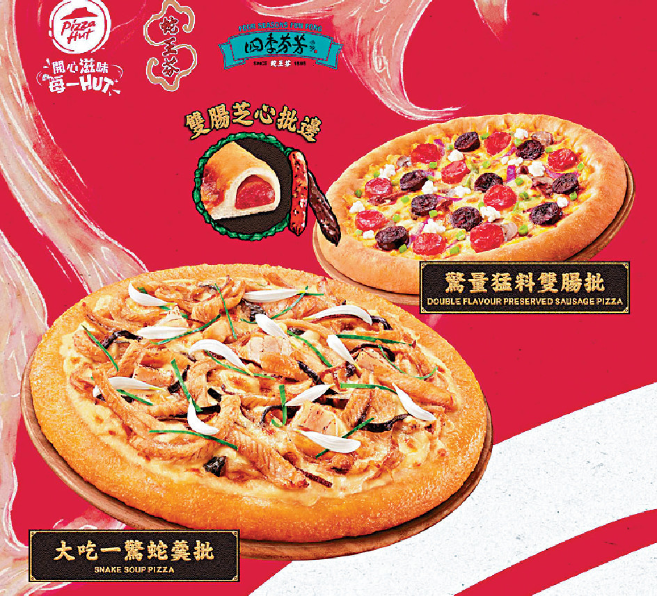 秋風起,最啱食蛇羹同臘味,不過配搭Pizza,你又試過未?Pizza Hut就首度聯手百年老字號「蛇王芬」,推出年度限定「大吃一驚蛇羹批」同「驚量猛料雙腸批」,真正做到新舊中西雙合璧!雖然正宗意大利人見到好可能激死,不過推出後大受歡迎,單日就賣出過千個,連CNN都報道推介,話唔定成為「鴛鴦」、「奶茶」之後,又一款香港地道美食!