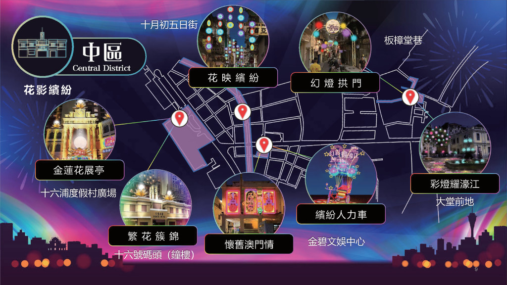 廣場上數碼屏幕館用互動屏幕展示澳門文化、美食及景觀等,俾大家更深入了解呢個美麗城市。而喺十月初五日街道上嘅圓形花朵圖案將帶來絢麗色彩,引導你前行。唔好唔記得金碧文娛中心仲有兩個採用LED霓虹燈牌打造嘅澳門70年代作藍本,富有中華文化節慶圖案嘅懷舊澳門情同利用發光花朵打造引人注目視覺盛宴嘅繽紛人力車,趁住假日去一趟澳門一次過行晒佢啦!