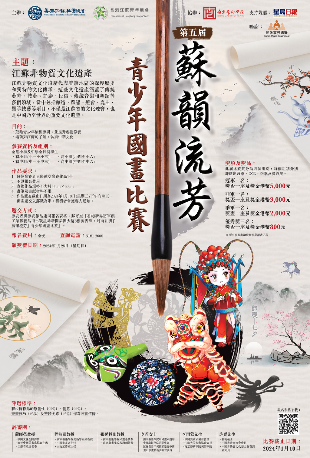 現今社會均主張讓年輕新一代發揮創意,兼且增強認識國家文化。要做到一舉兩得,就要鼓勵他們參加由香港江蘇社團總會、香港江蘇青年總會主辦,聯同南京藝術學院合辦的「蘇韻流芳」青少年國畫比賽,比賽分為初小組、高小組、初中組和高中組四個組別,小一至小六以及中一至中六全日制學生均可報名參加。參賽者需以「江蘇省非物質文化遺產」為主題創作作品,評審團將根據作品的技術水平、藝術表現力、創作思想以及對非物質文化遺產的呈現來評選作品。