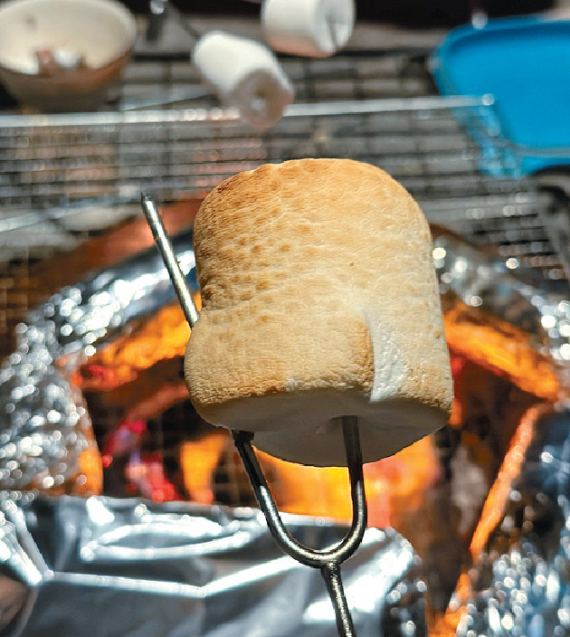把棉花糖放在營火上,熱力會使魚膠熔化,同時會焦糖化,散發出香甜的味道,變成外脆內軟的甜點。