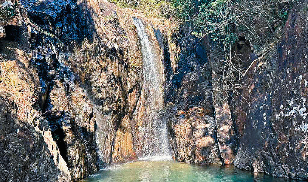 行了不久,見路邊竪一小牌,禁上入內,不准游泳,入口長滿小樹,下斜又狹窄,朋友見狀怕跣腳,放棄探險,惟有一人出發,小路鮮有人行,小樹枝伸出阻擋,腳下水土流失,變成爛泥路,樹根凸出,又濕又滑,只好步步為營,生怕失蹄倒下,害了朋友等候和擔心,手扶樹枝,探足慢慢落坡,不一會抵達一處小石灘,有幾塊巨型大石,烏黑發亮,不知躺在小石灘上多少億萬年,前面是一個碧綠水池,盡頭是一小溪瀑,流水潺潺,四周樹蔭籠罩,包圍着這一個小天地,一個人跡罕至的秘境,令人心情豁然開朗,頓感天地長存,世事何足掛齒。正想把手機拍的照片傳給朋友,可惜沒網絡,後來搜查才知,這個仙境名為潭崗石澗,小溪瀑叫潭崗飛瀑(見圖)。