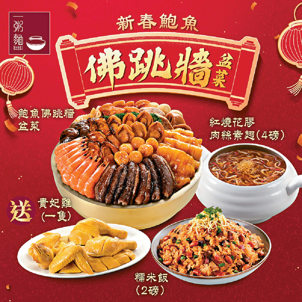 農曆年象徵着一年之始,是全家共聚慶新年的重要節日。一粥麵推出「新春鮑魚佛跳牆盆菜」(6位用),象徵新年吉祥如意、福壽雙全。其中盆菜有齊十頭鮑魚、瑤柱、海參、花膠、蠔豉等豪華食材,同時推出的「新春鮑魚佛跳牆盆菜」套餐(6位用)更加入紅燒花膠肉絲素翅(4磅)及糯米飯(2磅),為新年送上最滋味的祝福!