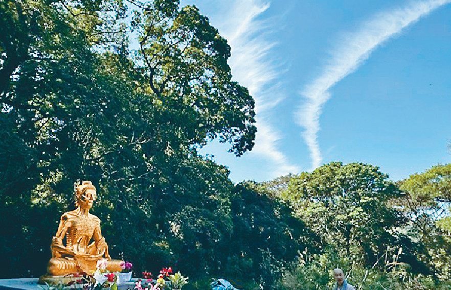道場四周是樹林,涼風拂面,只聞雀鳥聲,但見蝴蝶圍着供奉佛的鮮花飛舞。隨法師向佛參拜,再走入深山,天外有天,原來還有一塊巨大圓形大石,表面平如小舞台,可容數十人,心想在此打座,最合悟道。