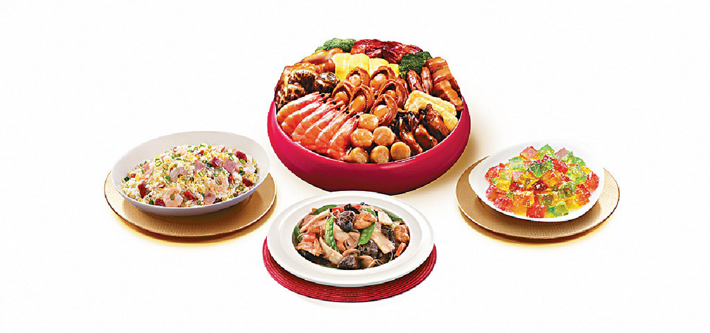 鮑魚福聚盆菜(6位用)選用原隻蠔皇鮑魚、北海道原粒元貝、韓國生曬蠔豉及豉油皇蝦(各6隻)與十多款珍貴食材,只需$878。而「豐盛團聚盆菜宴」(10至12位用)則包括豐盛團聚盆菜、南乳粗齋(2.5磅)、燒味拼盤、揚州炒飯及椰絲啫喱糖(各2磅),優惠價亦只需$1,238。另外亦可以$198加配雙囍炆伊麵(3磅)及椰絲啫喱糖(2磅)。