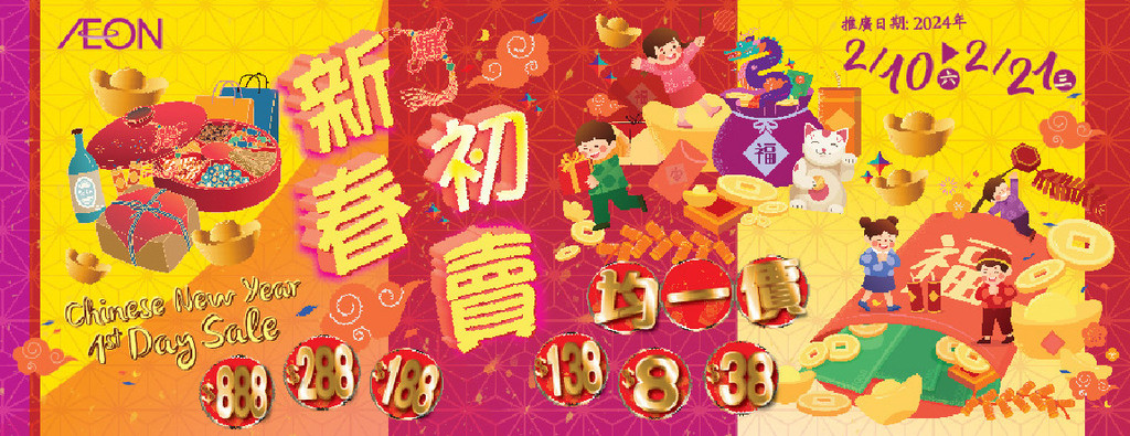由即日起至2月21日的新春期間,AEON舉行「新春初賣」折扣優惠,一系列精選均一價商品以特價發售。特價品包括新鮮食材、衣服、玩具及家品等,讓大家與家人喜氣洋洋過新年。而AEON會員在推廣期間購買「新春初賣」之廣告商品,更可獲3倍會員積分。