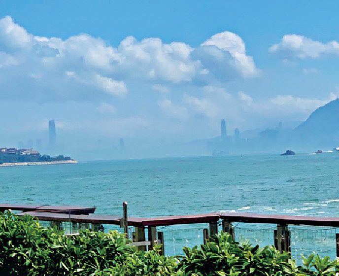 我們進餐前先到老虎頭郊遊徑附近的觀景台,飽覽愉景灣全景,碼頭、海灘和酒店都在腳下,維港兩岸的高樓在薄霧中若隱若現,更顯詩意。通往觀景台的小路上長滿了高高的芒草,不用上大東山也可影到被芒草包圍的感覺。