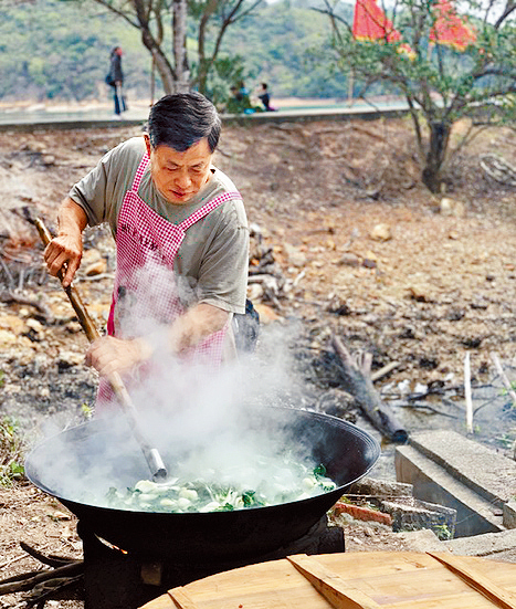 走了一圈回到村口,村民已陸續回來,兩個大爐正燒得旺盛,大廚一邊在煮冬菇炆排骨,一邊在炒白菜,還有火爐在蒸芋頭扣肉和燴番薯。腰果已炸起用作炒雞丁,一大盆切好的青蔥在靜待着。熱葷差不多煮好了,開始斬客家鹹雞。十三圍的客家盛宴也快將開始,但要先行重要儀式,到伯公壇前舞麒麟和上香,祈求伯公護祐五穀豐登、四境平安。